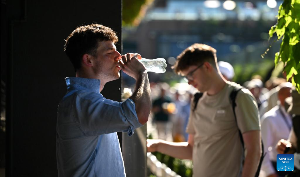 Imagen del 30 de junio de 2025 de un hombre bebiendo agua después de rellenar su botella en el día de apertura del Campeonato de Wimbledon, en Londres, Reino Unido. Los aficionados al tenis se enfrentaron el lunes al comienzo más caluroso de Wimbledon jamás registrado, ya que la temperatura alcanzó los 32 grados centígrados. (Xinhua/Li Ying)