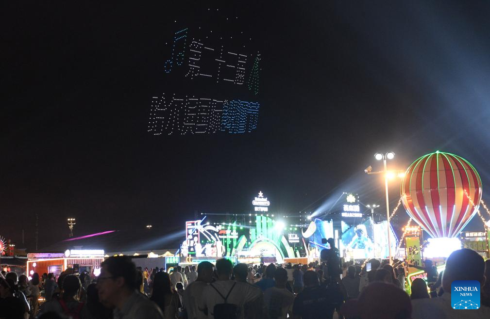 Un espectáculo de luces de drones se escenifica en el 23.º Festival Internacional de la Cerveza de Harbin, provincia nororiental china de Heilongjiang, el 5 de julio de 2025. (Fotografía de Liu Yang/Xinhua.)