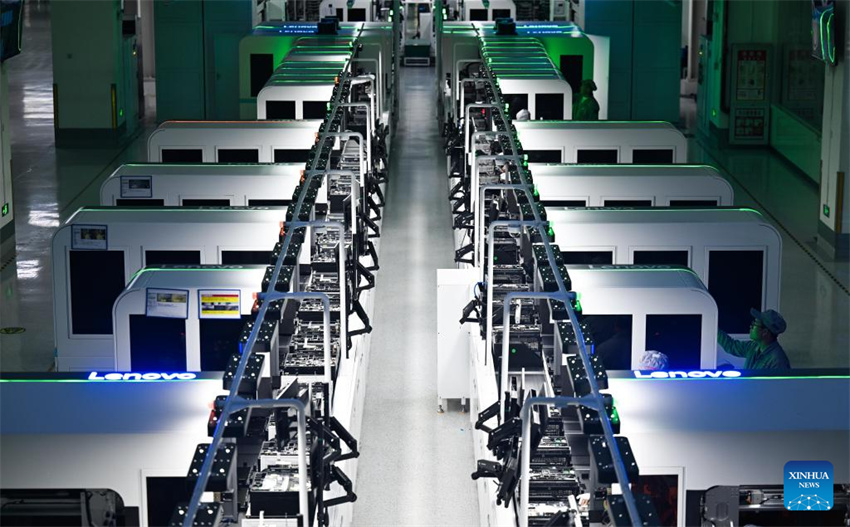 Esta foto tomada el 4 de julio de 2025 muestra la línea de producción de portátiles de la fábrica de producción inteligente neutra en carbono de Lenovo, en la ciudad septentrional china de Tianjin. En los últimos años, Tianjin ha apostado por construir fábricas inteligentes y acelerar la profunda integración de la economía digital con la real. Hasta ahora, la ciudad ha establecido un total de 400 fábricas inteligentes y talleres digitales, promoviendo continuamente la transformación digital de su sector manufacturero. (Xinhua/Zhao Zishuo.)