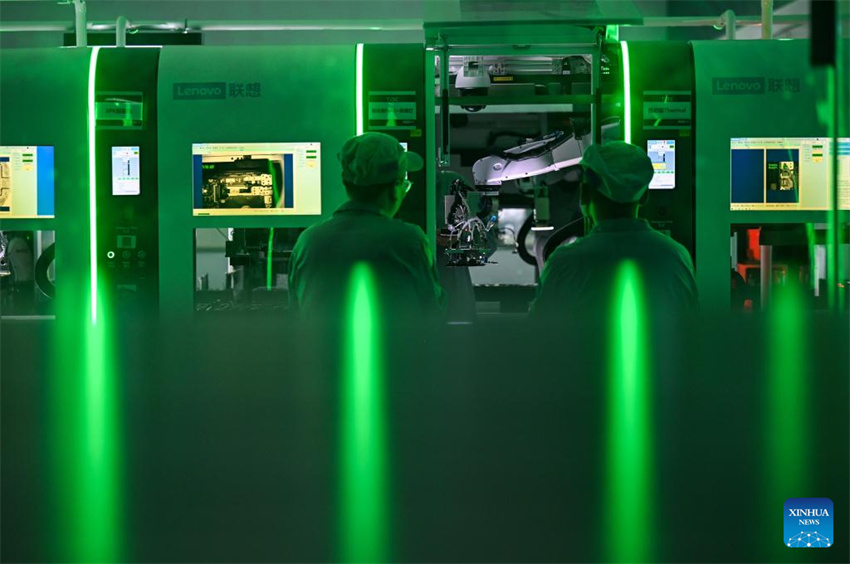 Miembros del personal comprueban los dispositivos automáticos en la zona de pruebas de la fábrica de producción inteligente neutra en carbono de Lenovo en la ciudad septentrional china de Tianjin, el 4 de julio de 2025. (Xinhua/Zhao Zishuo.)