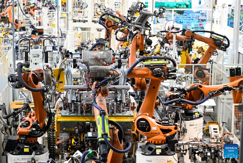 Brazos robóticos operan dentro de un taller de soldadura en la base del norte de China de FAW-Volkswagen en Tianjin, el 7 de julio de 2025. (Xinhua/Zhao Zishuo.)