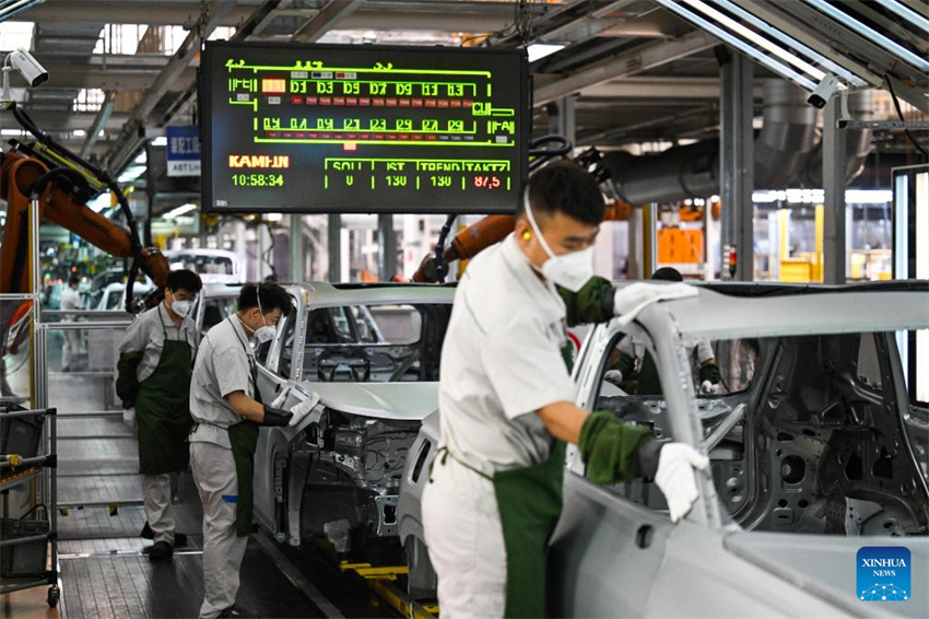Miembros del personal comprueban los productos en proceso dentro de un taller de soldadura en la base del norte de China de FAW-Volkswagen en Tianjin, el 7 de julio de 2025. (Xinhua/Zhao Zishuo.)