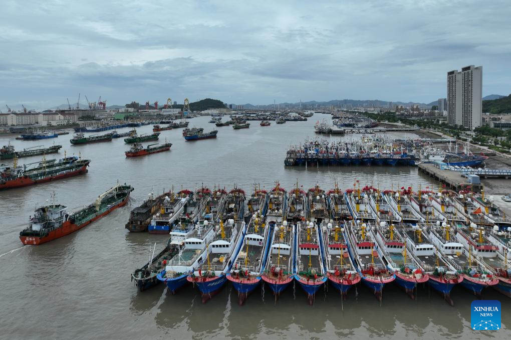 Esta foto aérea tomada por un dron el 7 de julio de 2025 muestra embarcaciones atracadas en el puerto de Shenjiamen para refugiarse de un tifón que se aproxima en Zhoushan, provincia oriental china de Zhejiang. (Foto de Zou Xunyong/Xinhua.)