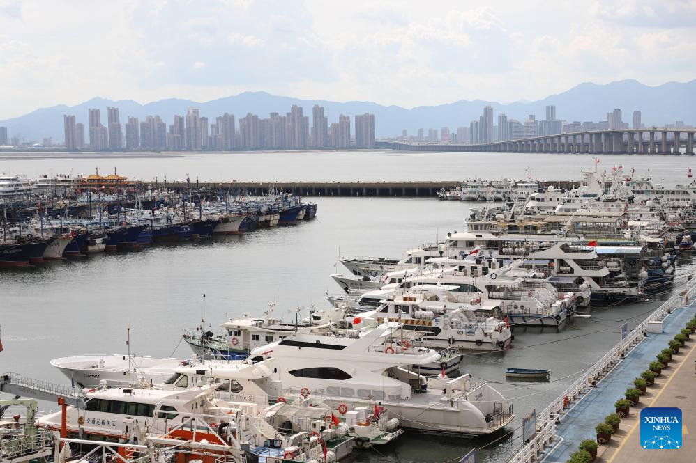 Barcos amarrados en un puerto para refugiarse de un tifón que se aproxima en Xiamen, provincia suroriental china de Fujian, el 6 de julio de 2025. (Foto de Zeng Demeng/Xinhua.)