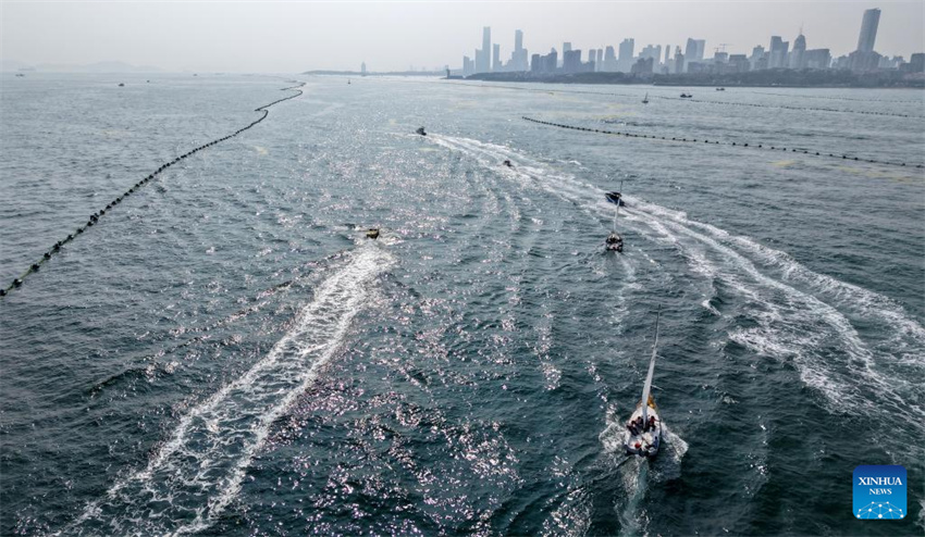 Una fotografía aérea tomada con dron el 10 de julio de 2025 muestra yates y veleros participando en un evento náutico en la zona de la bahía de Laolong, en Qingdao, provincia oriental china de Shandong. (Xinhua/Li Ziheng.)