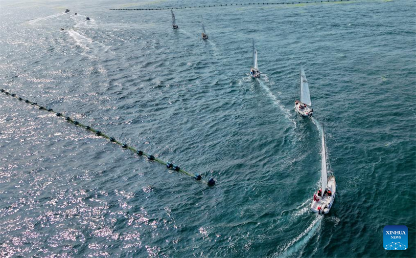 Una fotografía aérea tomada por un dron el 10 de julio de 2025 muestra yates y veleros participando en un evento náutico en la zona de la bahía de Laolong, en Qingdao, provincia oriental china de Shandong. (Xinhua/Li Ziheng.)