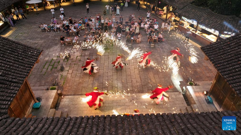 Imagen tomada con un dron el 12 de julio de 2025 de visitantes observando una presentación en un punto escénico, en el distrito autónomo tujia y miao de Youyang, en la municipalidad de Chongqing, en el suroeste de China. Las altas temperaturas durante las vacaciones de verano han revitalizado la economía para refrescarse en todo el país. (Xinhua/Qiu Hongbin)