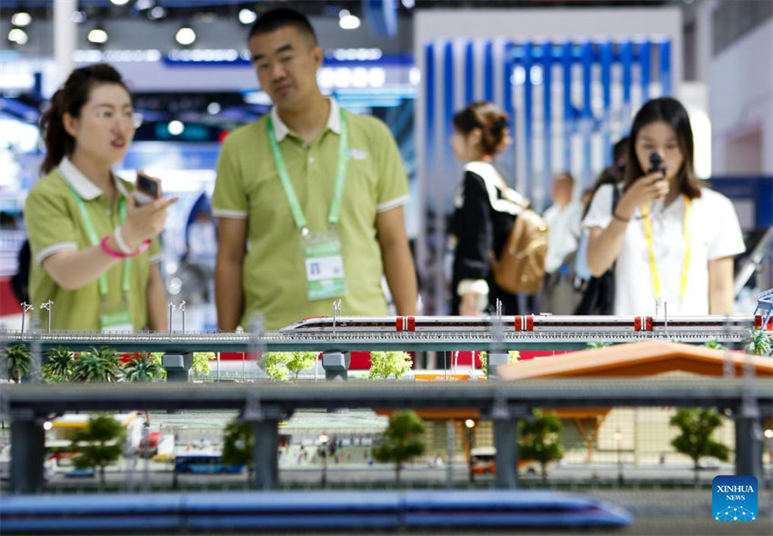 Visitantes observan una maqueta expuesta por China Railway Rolling Stock Corporation (CRRC) en la zona de la Cadena de Fabricación Avanzada durante la tercera Exposición Internacional de la Cadena de Suministro de China (CISCE) en Beijing, capital de China, el 17 de julio de 2025. (Xinhua/Ding Hongfa.)