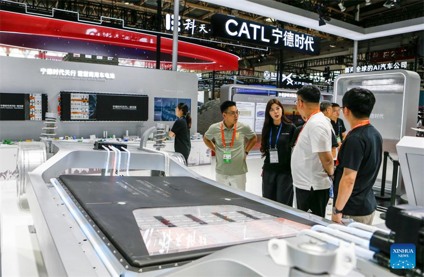 Visitantes se informan sobre productos de baterías en el estand del fabricante chino de baterías para vehículos eléctricos (VE) CATL en la zona de la Cadena de Vehículos Inteligentes de la tercera Exposición Internacional de la Cadena de Suministro de China (CISCE) en Beijing, capital de China, el 16 de julio de 2025. (Xinhua/Ding Hongfa.)