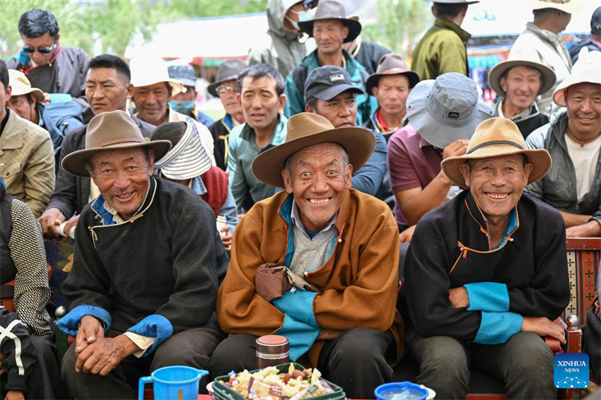 Un grupo de personas observa una representación de ópera tibetana en un parque del distrito de Namling de la ciudad de Xigaze, en la región autónoma de Xizang, en el suroeste de China, el 16 de julio de 2025. (Xinhua/Li Xin.)