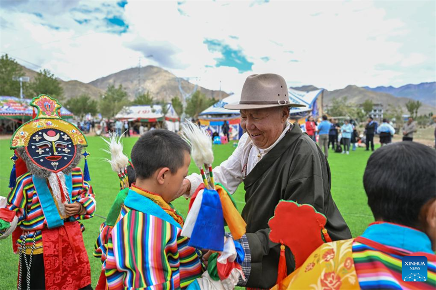 Niños actores se preparan para interpretar ópera tibetana en un parque del distrito de Namling de la ciudad de Xigaze, región autónoma de Xizang, en el suroeste de China, el 16 de julio de 2025. (Xinhua/Li Xin.)