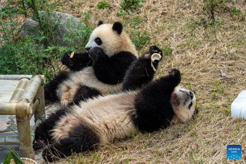 Dos cachorros del panda gigante Xidou yacen en el suelo disfrutando de deliciosa comida en la base del panda gigante de Shenshuping de la Reserva Natural Nacional de Wolong, en la provincia suroccidental china de Sichuan, el 17 de julio de 2025. (Xinhua/Xue Chen.)
