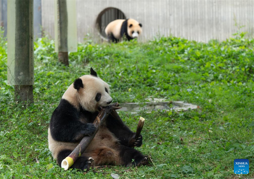 Un panda gigante come bambú en la base del panda gigante de Shenshuping de la Reserva Natural Nacional de Wolong, en la provincia suroccidental china de Sichuan, el 17 de julio de 2025. (Xinhua/Xue Chen.)
