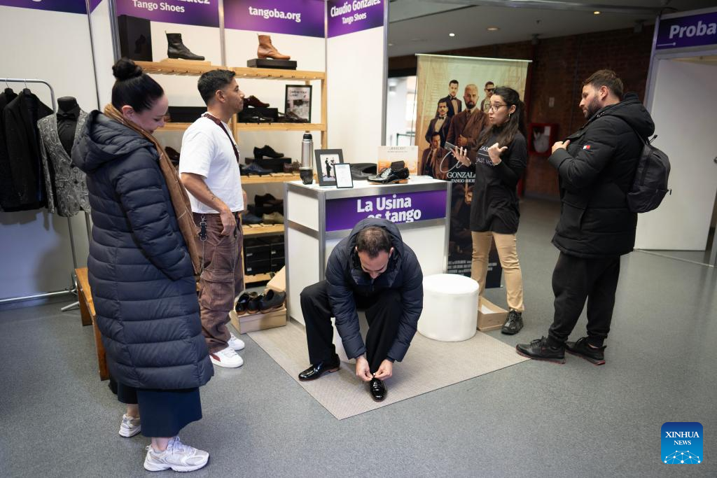 Imagen del 20 de agosto de 2025 de personas visitando un estand de zapatos de baile de tango de la feria instalada en el marco del Festival y Mundial de Tango 2025, en el Auditorio de la Usina del Arte, en la ciudad de Buenos Aires, capital de Argentina. La capital de Argentina, Buenos Aires, comenzó a vibrar desde el miércoles con una nueva edición del Festival y Mundial de Tango 2025, actividad que tuvo su puntapié formal con actuaciones históricas de orquestas de tango, clases y exhibiciones en distintos escenarios. (Xinhua/Martín Zabala)