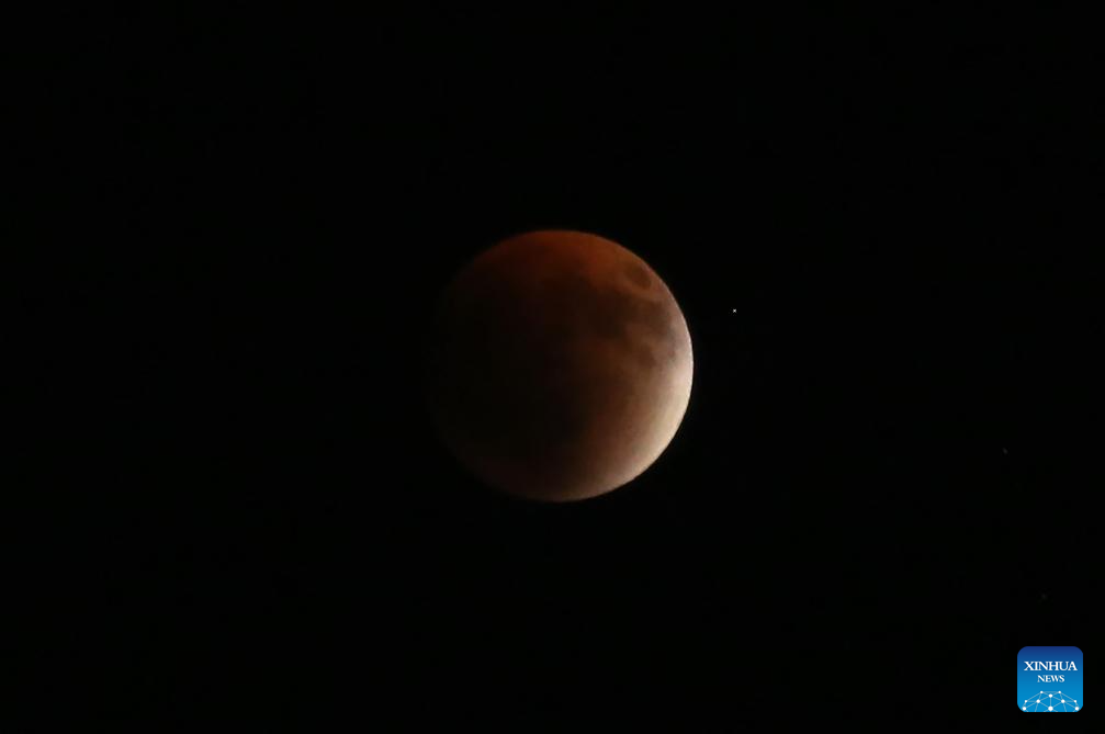 Imagen del 7 de septiembre de 2025 del eclipse lunar en el cielo sobre Naplusa, en el norte de Cisjordania. (Xinhua/Nidal Eshtayeh)