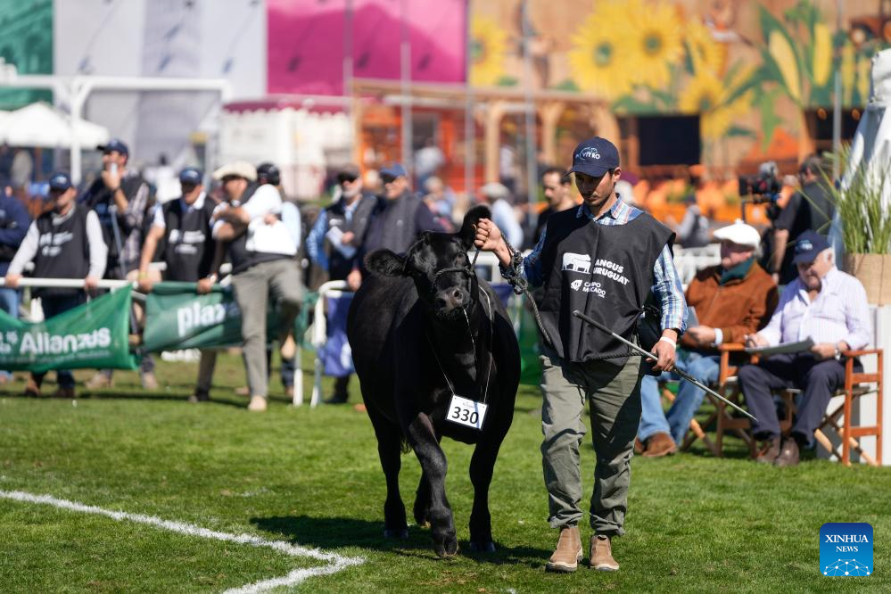 Un vacuno es presentado a los jueces durante la edición 120 de la Exposición Internacional de Ganadería y Muestra Internacional Agro Industrial y Comercial "Expo Prado", en Montevideo, capital de Uruguay, el 9 de septiembre de 2025. (Xinhua/Nicolás Celaya)