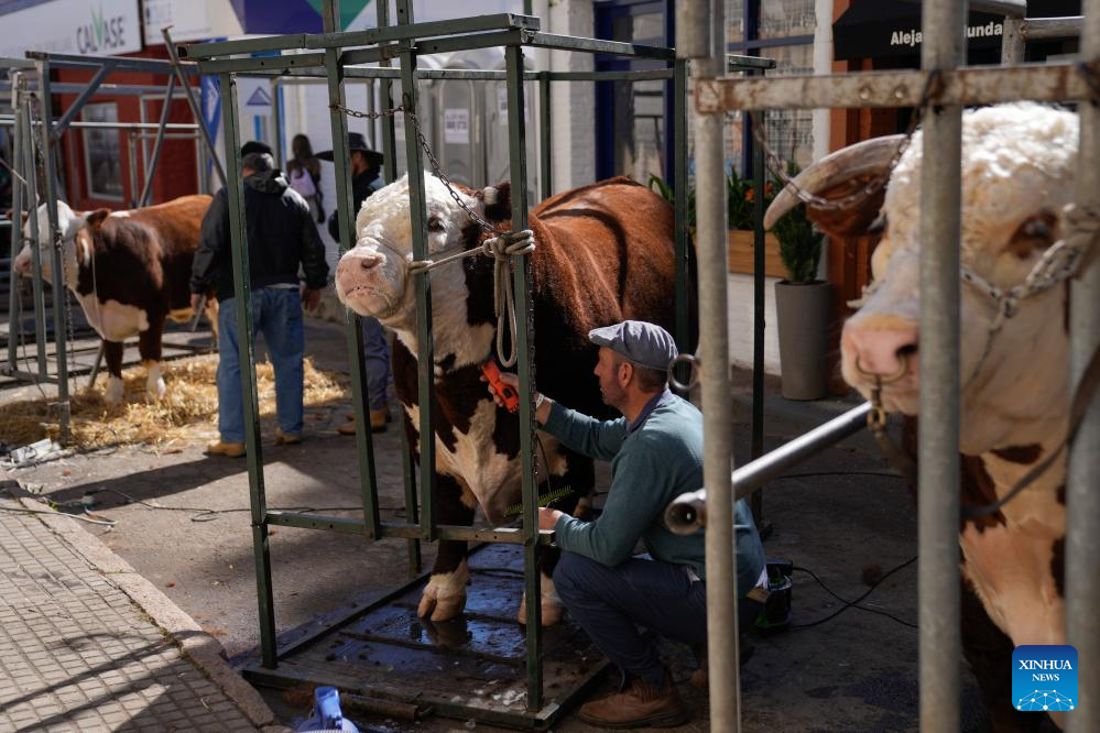 Un hombre corta el pelo a un vacuno para ser presentado a los jueces durante la edición 120 de la Exposición Internacional de Ganadería y Muestra Internacional Agro Industrial y Comercial "Expo Prado", en Montevideo, capital de Uruguay, el 9 de septiembre de 2025. (Xinhua/Nicolás Celaya)