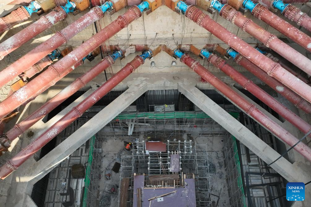 Una foto aérea tomada con un dron el 7 de septiembre de 2025 muestra la obra de una estación de metro en Shijiazhuang, provincia de Hebei, en el norte de China. (Xinhua/Yang Shiyao.)
