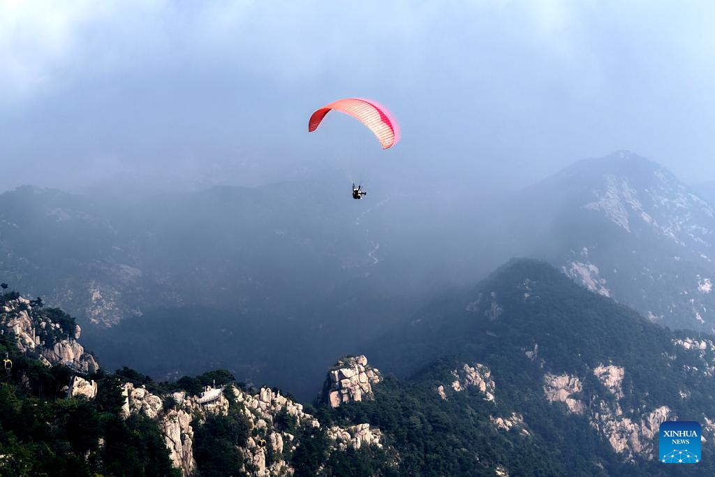 Una foto aérea tomada con dron el 14 de septiembre de 2025 muestra a turistas experimentando parapente en una zona panorámica de la ciudad de Linyi, en la provincia de Shandong, en el este de China. (Foto de Wu Jiquan/Xinhua.)