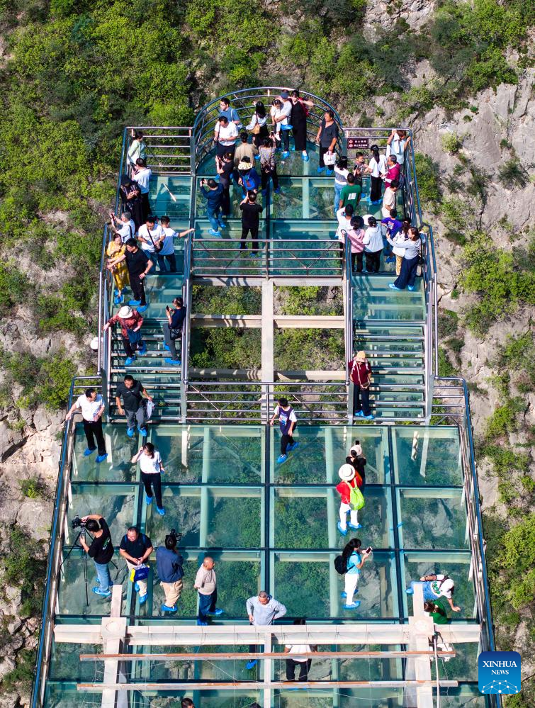 Una foto aérea tomada con dron el 14 de septiembre de 2025 muestra a turistas visitando una zona panorámica en el distrito de Jingyang de la ciudad de Xianyang, en la provincia de Shaanxi, en el noroeste de China. (Foto de Tang Dehong/Xinhua.)