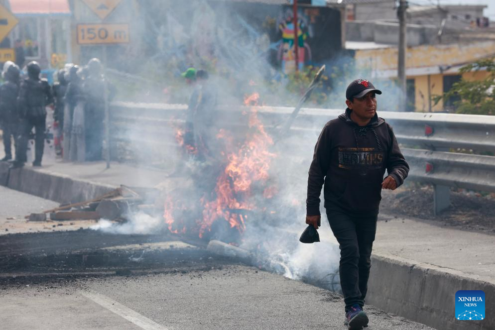 Un hombre camina frente a una barricada encendida durante una protesta por la eliminación del subsidio al diésel, en Quito, capital de Ecuador, el 16 de septiembre de 2025. El presidente de Ecuador, Daniel Noboa, decretó el martes estado de excepción por 60 días en siete provincias del país por "grave conmoción interna", derivada de las protestas y bloqueos de carreteras iniciados la víspera por gremios de transportistas en rechazo a la reciente eliminación del subsidio al diésel. (Xinhua/Ricardo Landeta)