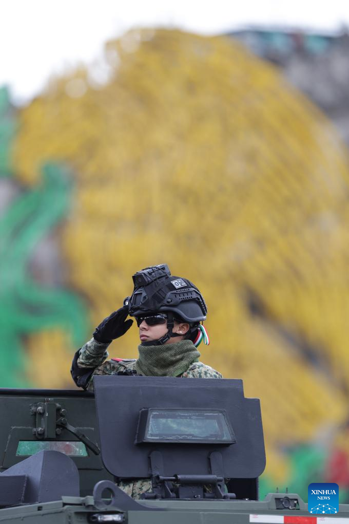 Una integrante del Ejército mexicano participa en el Desfile Cívico Militar en conmemoración del 215 aniversario de la Independencia de México, en la Ciudad de México, capital de México, el 16 de septiembre de 2025. México celebró el martes el aniversario 215 del inicio de la lucha independentista contra el colonialismo español con la realización del tradicional Desfile Cívico Militar en la Ciudad de México, con la particularidad de que por primera ocasión se presentaron honores y se rindió el parte de novedades a una mujer, Claudia Sheinbaum, primera presidenta y comandanta suprema de las Fuerzas Armadas del país latinoamericano. (Xinhua/Francisco Cañedo)
