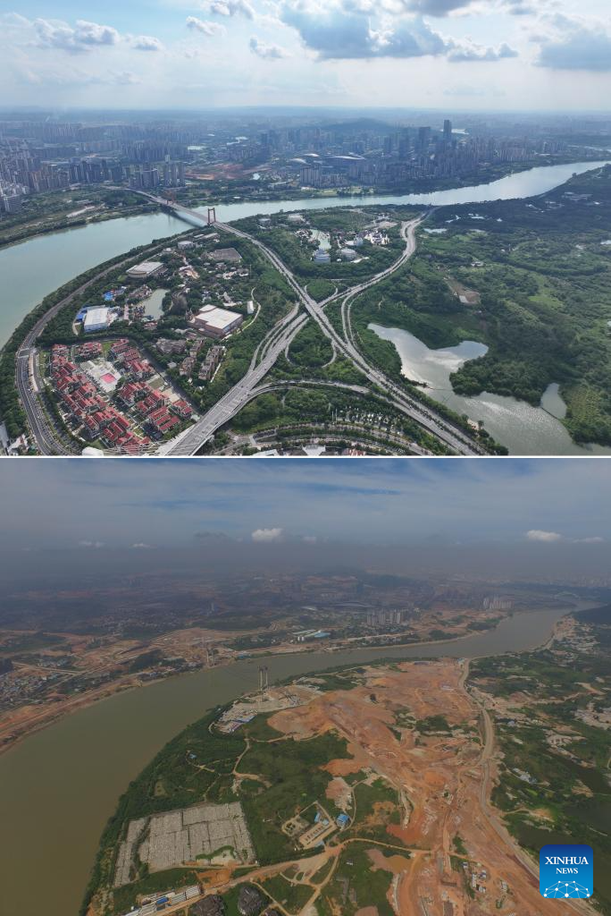 Este fotomontaje muestra una vista aérea de la ciudad cerca de la carretera Qinghuan en Nanning, región autónoma de la etnia zhuang de Guangxi, en el sur de China, el 6 de septiembre de 2025 (arriba) y el 13 de agosto de 2015 (abajo). (Xinhua/Huang Xiaobang).