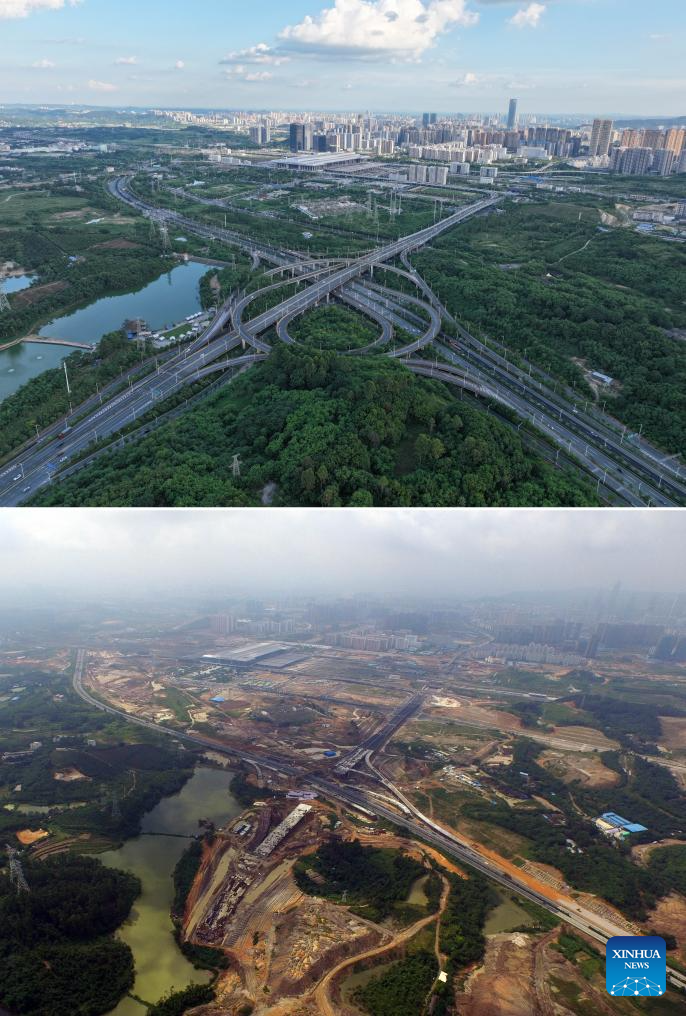 Este fotomontaje muestra una vista aérea del intercambiador de Beifeng en construcción el 15 de agosto de 2015 (abajo) y después de su finalización el 6 de septiembre de 2025 (arriba) en Nanning, región autónoma de la etnia zhuang de Guangxi, en el sur de China. (Xinhua/Huang Xiaobang).