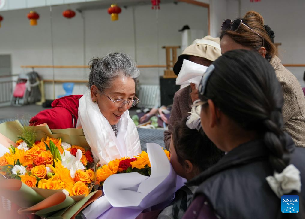Unas niñas entregan flores a su maestra Pasang para expresar sus deseos tardíos por el Día del Maestro en el centro público de arte en Lhasa, en la región autónoma de Xizang, suroeste de China, el 14 de septiembre de 2025. (Xinhua/Jigme Dorje).