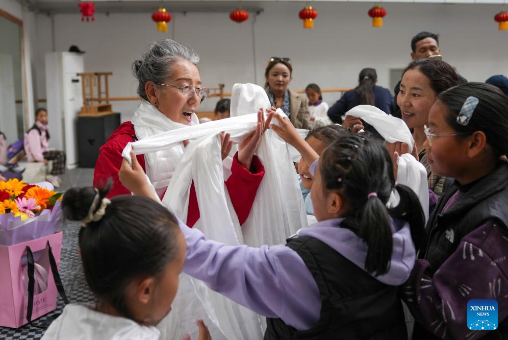 Unas niñas regalan una pieza de hada a su maestra Pasang para expresar sus deseos tardíos por el Día del Maestro en el centro público de arte en Lhasa, en la región autónoma de Xizang, suroeste de China, el 14 de septiembre de 2025. (Xinhua/Jigme Dorje).