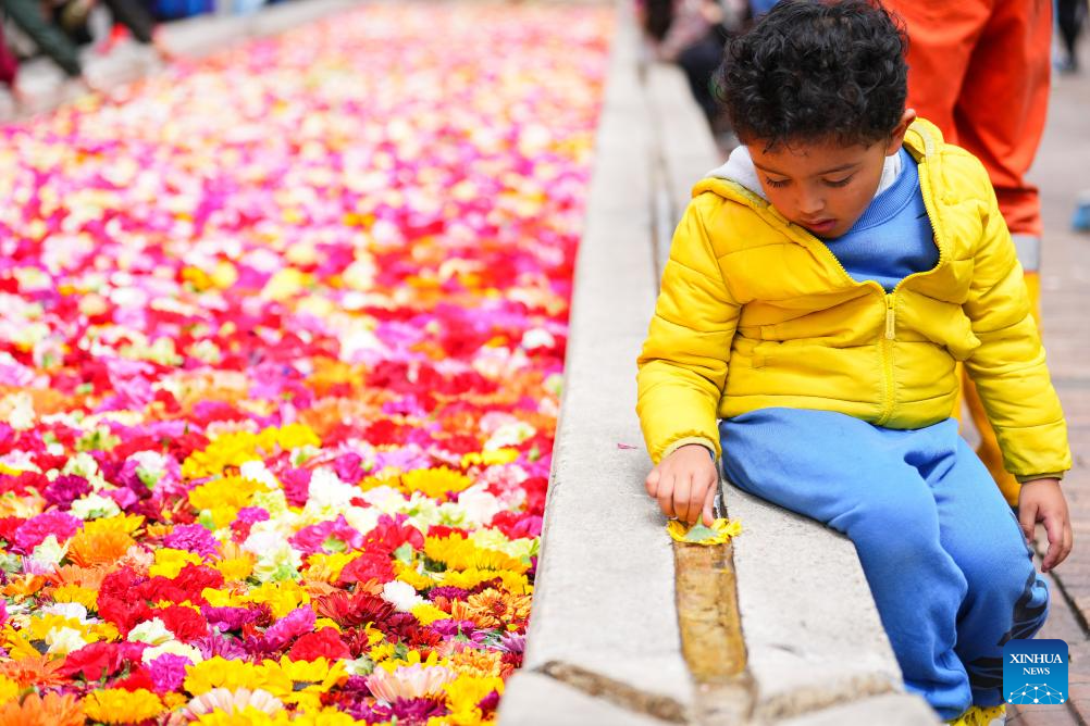 Un niño coloca una flor en la instalación floral "El Canto del Río" en el marco de la Bienal Internacional de Arte y Ciudad BOG25, en Bogotá, capital de Colombia, el 20 de septiembre de 2025. (Xinhua/Andrés Moreno)