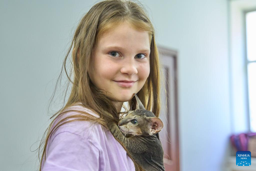 Una niña sostiene a su Peterbald durante una exposición felina en Vladivostok, Rusia, el 21 de septiembre de 2025. (Foto de Guo Feizhou/Xinhua).