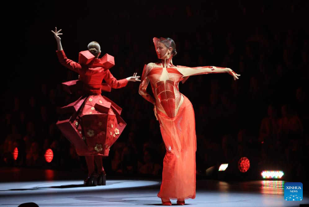 Imagen del 19 de septiembre de 2025 de modelos presentando creaciones durante un desfile del Mundo del Arte que se puede Vestir, en Wellington, Nueva Zelanda. (Xinhua/Meng Tao)