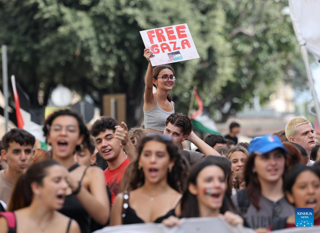 Jóvenes participan en una protesta a favor de Palestina en Roma, Italia, el 22 de septiembre de 2025. (Xinhua/Li Jing).