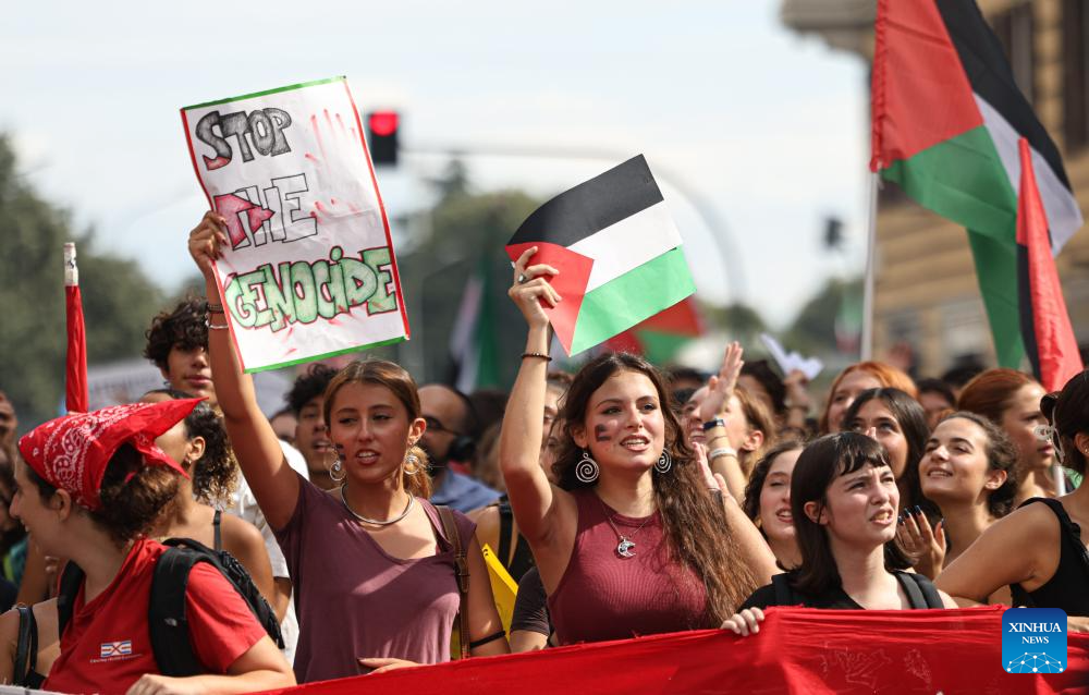 Jóvenes participan en una protesta a favor de Palestina en Roma, Italia, el 22 de septiembre de 2025. (Xinhua/Li Jing).