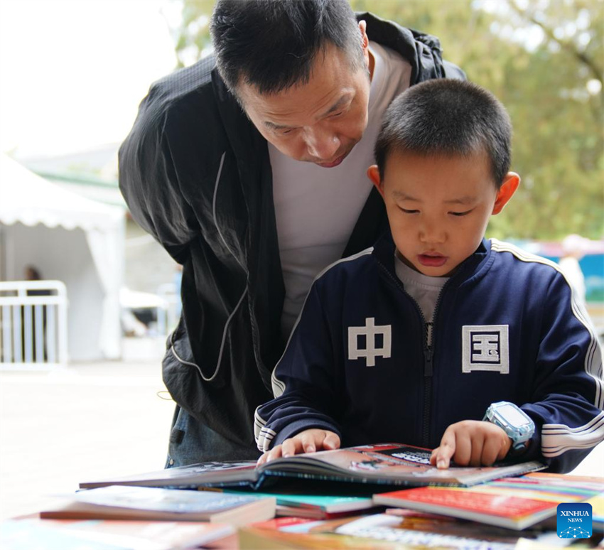Un niño lee un libro durante la Feria del Libro de Beijing 2025 en el Parque Ditan, el 22 de septiembre de 2025. (Xinhua/Dai Mingxuan).