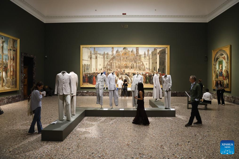 Imagen del 25 de septiembre de 2025 de personas observando creaciones exhibidas en la exposición "Giorgio Armani: Milano, per amore" en la Pinacoteca de Brera, en Milán, Italia. Más de 120 creaciones de Armani/Archivio son exhibidas entre las pinturas de la Pinacoteca de Brera desde el 24 de septiembre de 2025 hasta el 11 de enero de 2026, para honrar la trayectoria estilística del diseñador de moda italiano Giorgio Armani, fallecido el 4 de septiembre de 2025. (Xinhua/Li Jing)