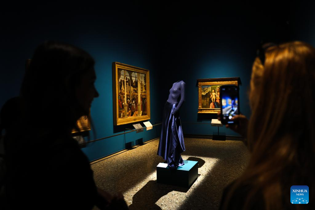Imagen del 25 de septiembre de 2025 de personas observando una creación exhibida en la exposición "Giorgio Armani: Milano, per amore" en la Pinacoteca de Brera, en Milán, Italia. Más de 120 creaciones de Armani/Archivio son exhibidas entre las pinturas de la Pinacoteca de Brera desde el 24 de septiembre de 2025 hasta el 11 de enero de 2026, para honrar la trayectoria estilística del diseñador de moda italiano Giorgio Armani, fallecido el 4 de septiembre de 2025. (Xinhua/Li Jing)
