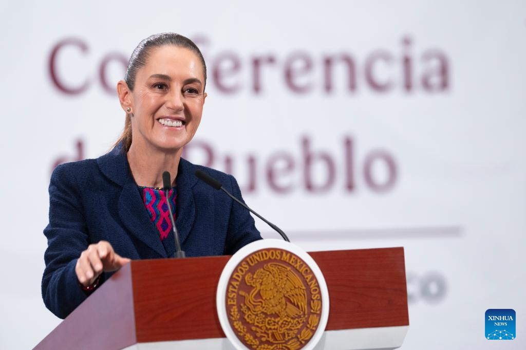 Imagen proveída por la Presidencia de México de la presidenta mexicana, Claudia Sheinbaum, sonriendo durante su conferencia de prensa matutina, en Palacio Nacional, en la Ciudad de México, capital de México, el 8 de octubre de 2025. Sheinbaum recordó el miércoles que el tratado entre México, Estados Unidos y Canadá (T-MEC) de libre comercio tiene carácter de ley en los tres países, por lo que cualquier intento de modificarlo requeriría una "revisión muy profunda". (Xinhua/Presidencia de México)