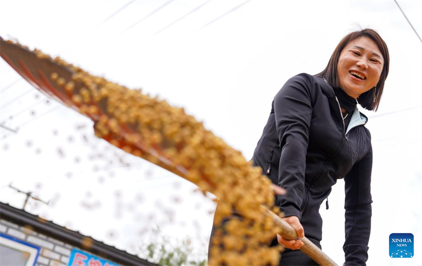 Han Fengxiang seca la soja recién cosechada en su cooperativa en el distrito de Lishu, provincia de Jilin, noreste de China, 9 de octubre de 2025. (Xinhua/Yan Linyun).