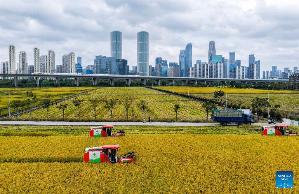 Imagen tomada con un dron el 21 de octubre de 2025 de cosechadoras recolectando arroz en un arrozal, con un tren de alta velocidad al fondo, en Hangzhou, en la provincia de Zhejiang, en el este de China. (Xinhua/Xu Yu)