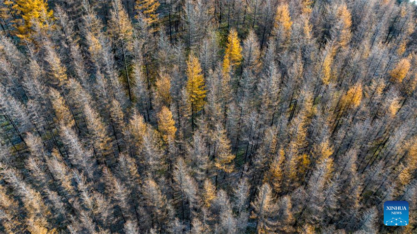 Una fotografía aérea tomada con un dron el 26 de octubre de 2025 captura el paisaje otoñal de la montaña Liupanshan en la ciudad de Guyuan, región autónoma de la etnia Hui de Ningxia, en el noroeste de China. (Xinhua/Wang Peng).