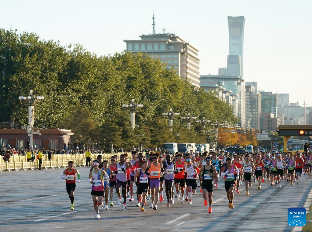 Participantes compiten durante el Maratón de Beijing 2025, en Beijing, capital de China, el 2 de noviembre de 2025. (Xinhua/Zhang Chenlin)