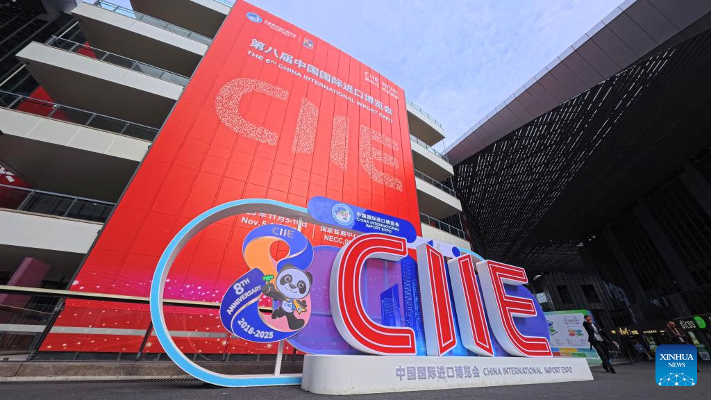 Imagen del 3 de noviembre de 2025 de una decoración temática de la Exposición Internacional de Importaciones de China (CIIE, por sus siglas en inglés), en el Centro Nacional de Exposiciones y Convenciones (Shanghai), en Shanghai, en el este de China. La VIII CIIE se celebrará en Shanghai del 5 al 10 de noviembre. (Xinhua/Fang Zhe)