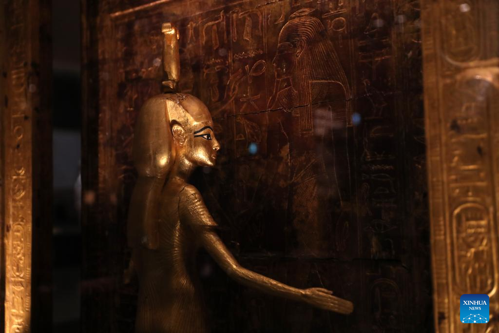Esta foto tomada el 4 de noviembre de 2025 muestra una exposición en la sala de exposiciones del rey Tutankamón del Gran Museo Egipcio en Giza, Egipto. El Gran Museo Egipcio (GEM), el museo más grande del mundo dedicado a una sola civilización, abrió sus puertas al público el martes. (Xinhua/Sui Xiankai)