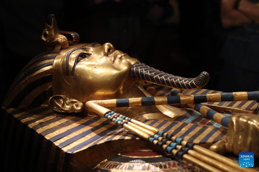 Esta foto tomada el 4 de noviembre de 2025 muestra detalles de un ataúd dorado en la sala de exposiciones del rey Tutankamón del Gran Museo Egipcio en Giza, Egipto. El Gran Museo Egipcio (GEM), el museo más grande del mundo dedicado a una sola civilización, abrió sus puertas al público el martes. (Xinhua/Sui Xiankai)