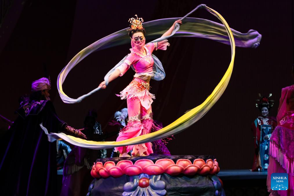 Imagen del 20 de septiembre de 2025 del drama de danza "Flores Llueven a lo largo de la Ruta de la Seda" siendo presentado en el Teatro de Dunhuang, en Dunhuang, en la provincia de Gansu, en el noroeste de China. La danza Dunhuang se refiere a un estilo de danza que tiene como objetivo dar vida a las figuras icónicas representadas en los antiguos murales de las Grutas de Mogao. Inspirándose en temas históricos, artistas contemporáneos han creado obras maestras de música y danza, como el clásico drama de danza "Flores Llueven a lo largo de la Ruta de la Seda", y "Bodhisattva de las Mil Manos". (Xinhua/Lang Bingbing)