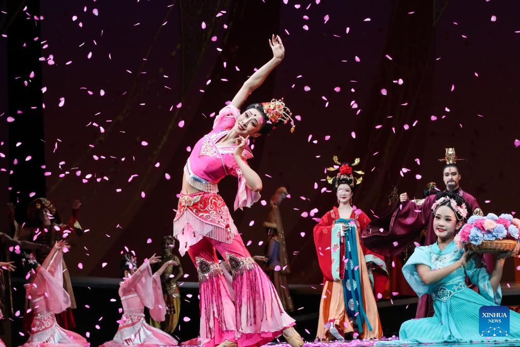 Imagen del 20 de septiembre de 2025 del drama de danza "Flores Llueven a lo largo de la Ruta de la Seda" siendo presentado en el Teatro de Dunhuang, en Dunhuang, en la provincia de Gansu, en el noroeste de China. La danza Dunhuang se refiere a un estilo de danza que tiene como objetivo dar vida a las figuras icónicas representadas en los antiguos murales de las Grutas de Mogao. Inspirándose en temas históricos, artistas contemporáneos han creado obras maestras de música y danza, como el clásico drama de danza "Flores Llueven a lo largo de la Ruta de la Seda", y "Bodhisattva de las Mil Manos". (Xinhua/Lang Bingbing)