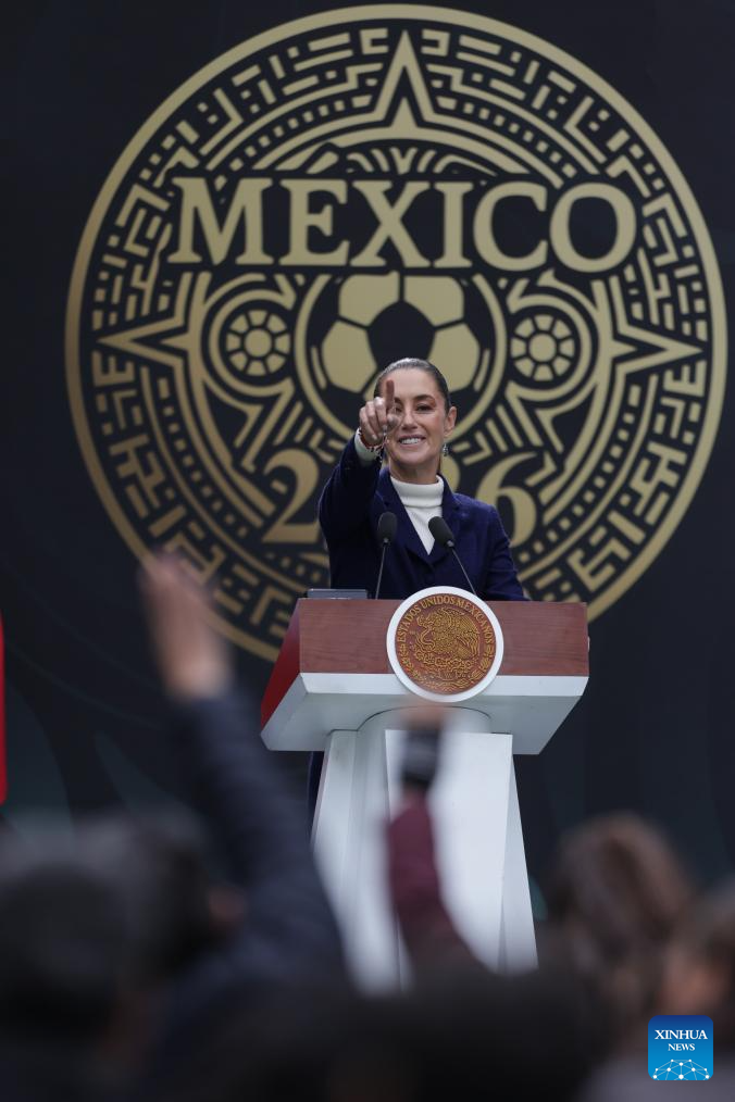 La presidenta mexicana, Claudia Sheinbaum, habla durante la presentación de la Copa Mundial FIFA 2026, en el Complejo Cultural Los Pinos, en la Ciudad de México, capital de México, el 10 de noviembre de 2025. Sheinbaum presentó el lunes la Copa Mundial FIFA 2026, cuya inauguración se realizará el 11 de junio en la Ciudad de México, y la calificó como una "fiesta mundialista" que llenará de alegría al país y al mundo. (Xinhua/Francisco Cañedo)