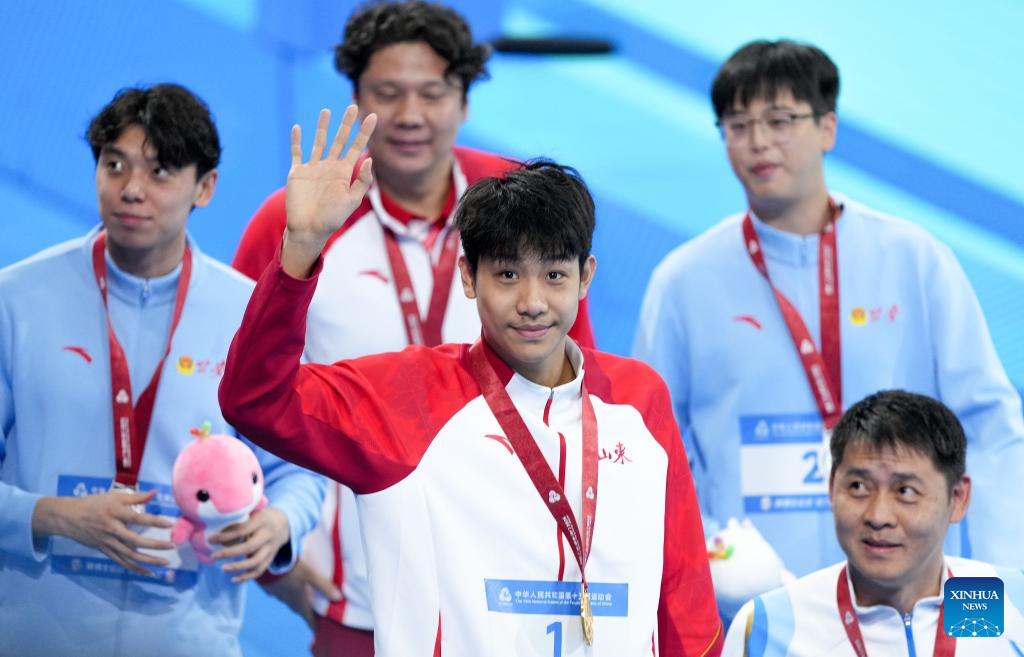 El medallista de oro Zhang Zhanshuo de Shandong (al frente) saluda al público después de la ceremonia de premiación de la final masculina de 200 metros libres de natación en los decimoquintos Juegos Nacionales de China en Shenzhen, el 12 de noviembre de 2025. (Xinhua/Du Yu).
